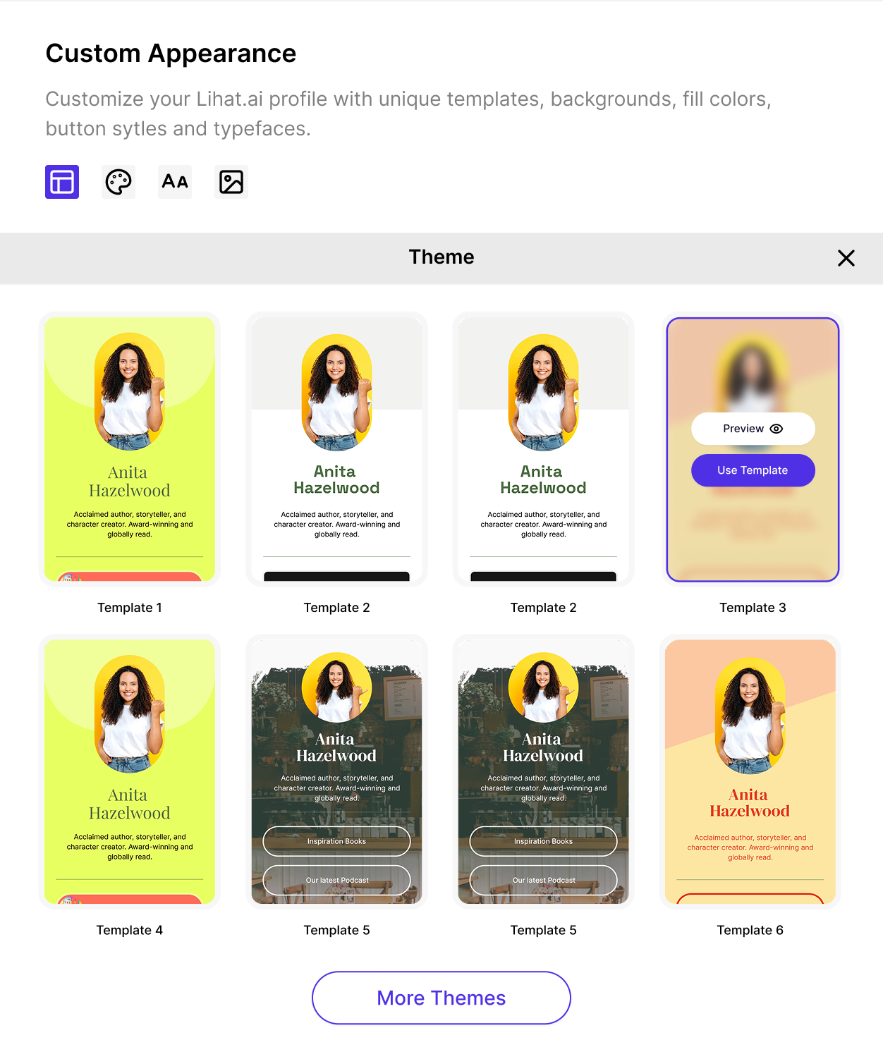 Themes define the overall structure and base styling of your Link Page, including button shapes, spacing, and text hierarchy.