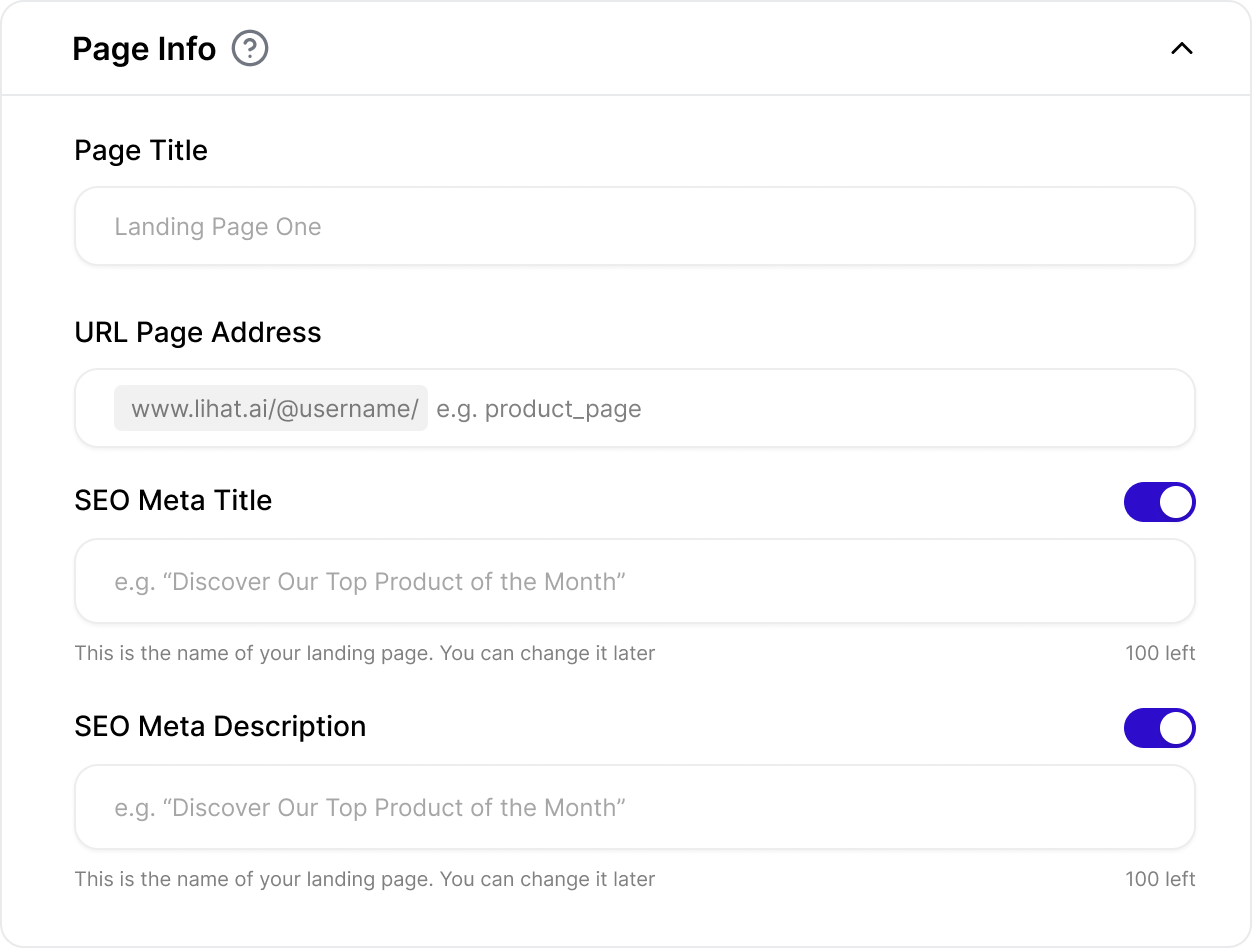 - URL Page Address: Your custom URL slug (e.g., lihat.ai/yourstore).