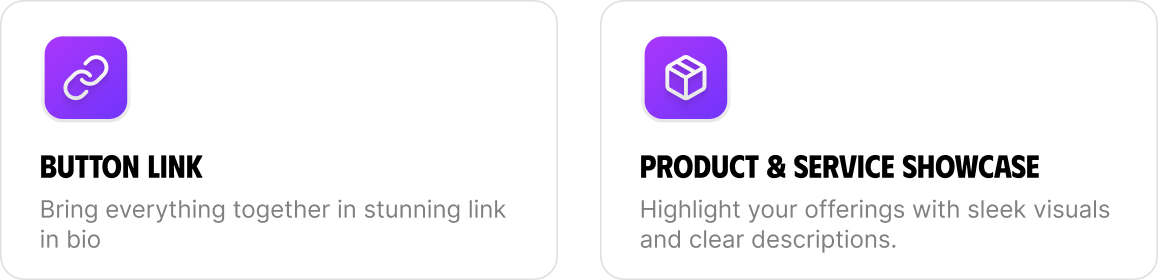 Example: “Visit Website”, “Join Telegram Group”, “Book a Call”. - Product Showcase — Product-style cards with images and titles to feature your offerings.